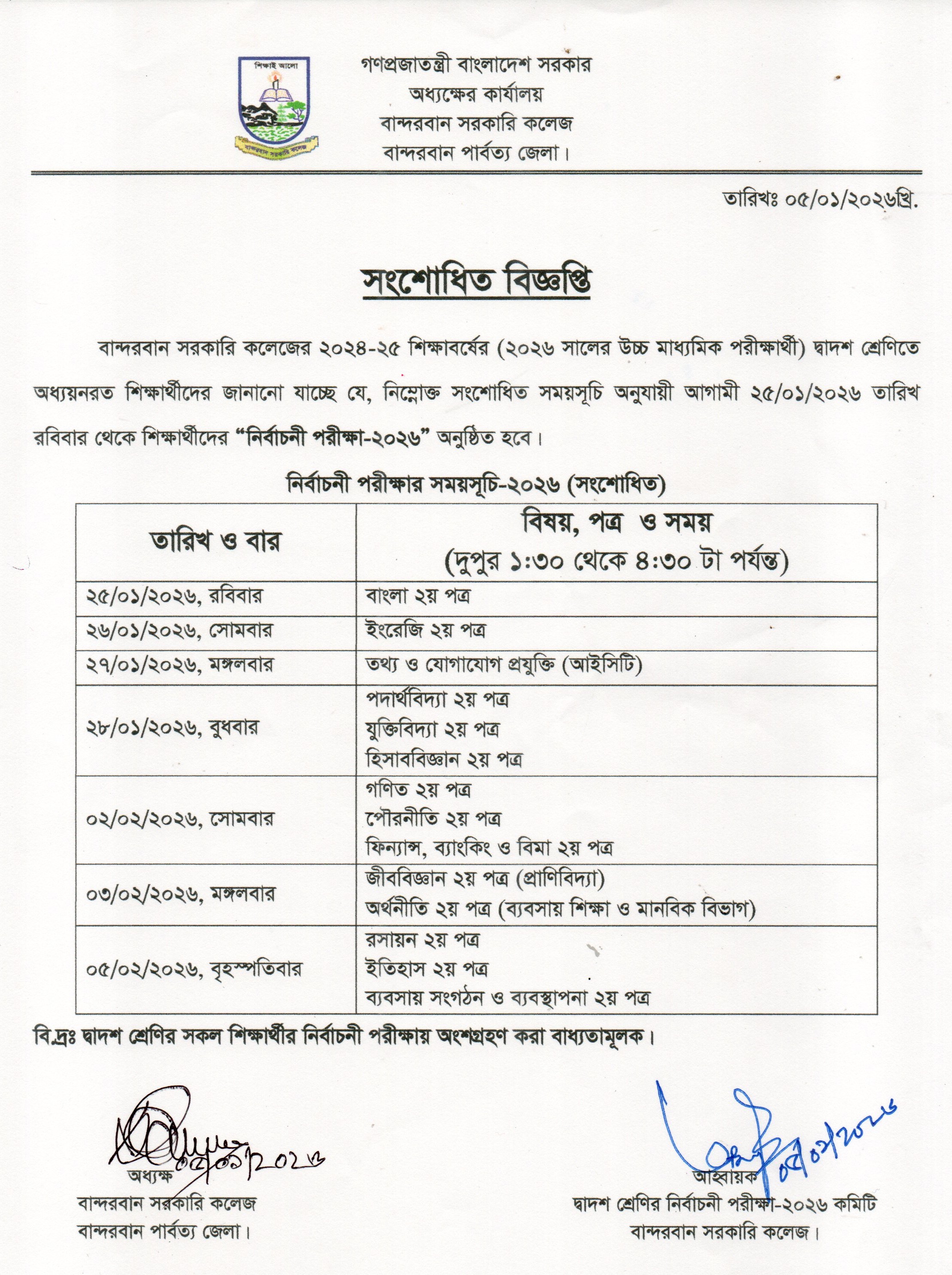 ২০২৫-২৬ শিক্ষাবর্ষের একাদশ শ্রেণির অর্ধবার্ষিক পরীক্ষা ২০২৬ এর সংশোধিত রুটিন