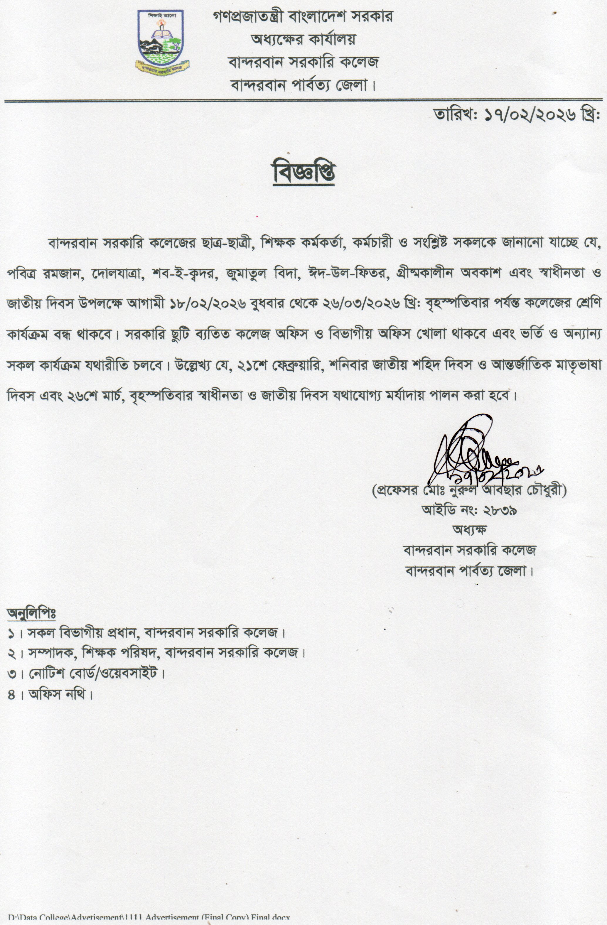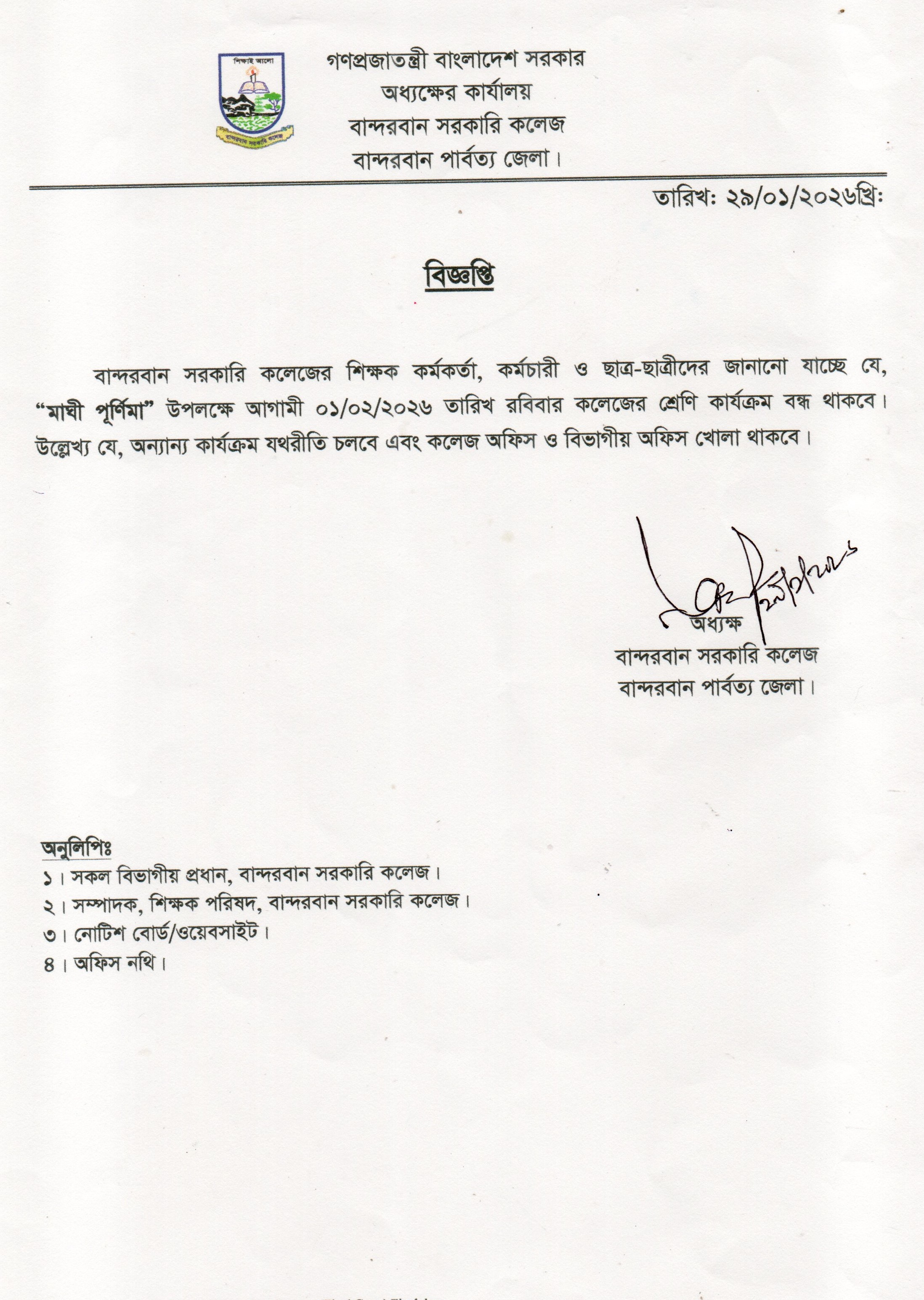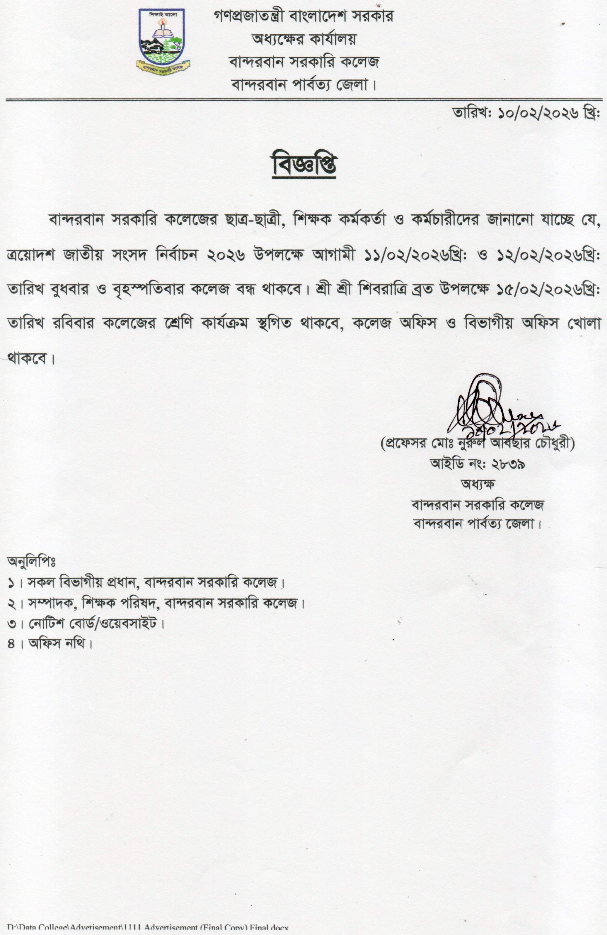 ত্রয়োদশ জাতীয় সংসদ নির্বাচন উপলক্ষে কলেজ বন্ধের বিজ্ঞপ্তি
