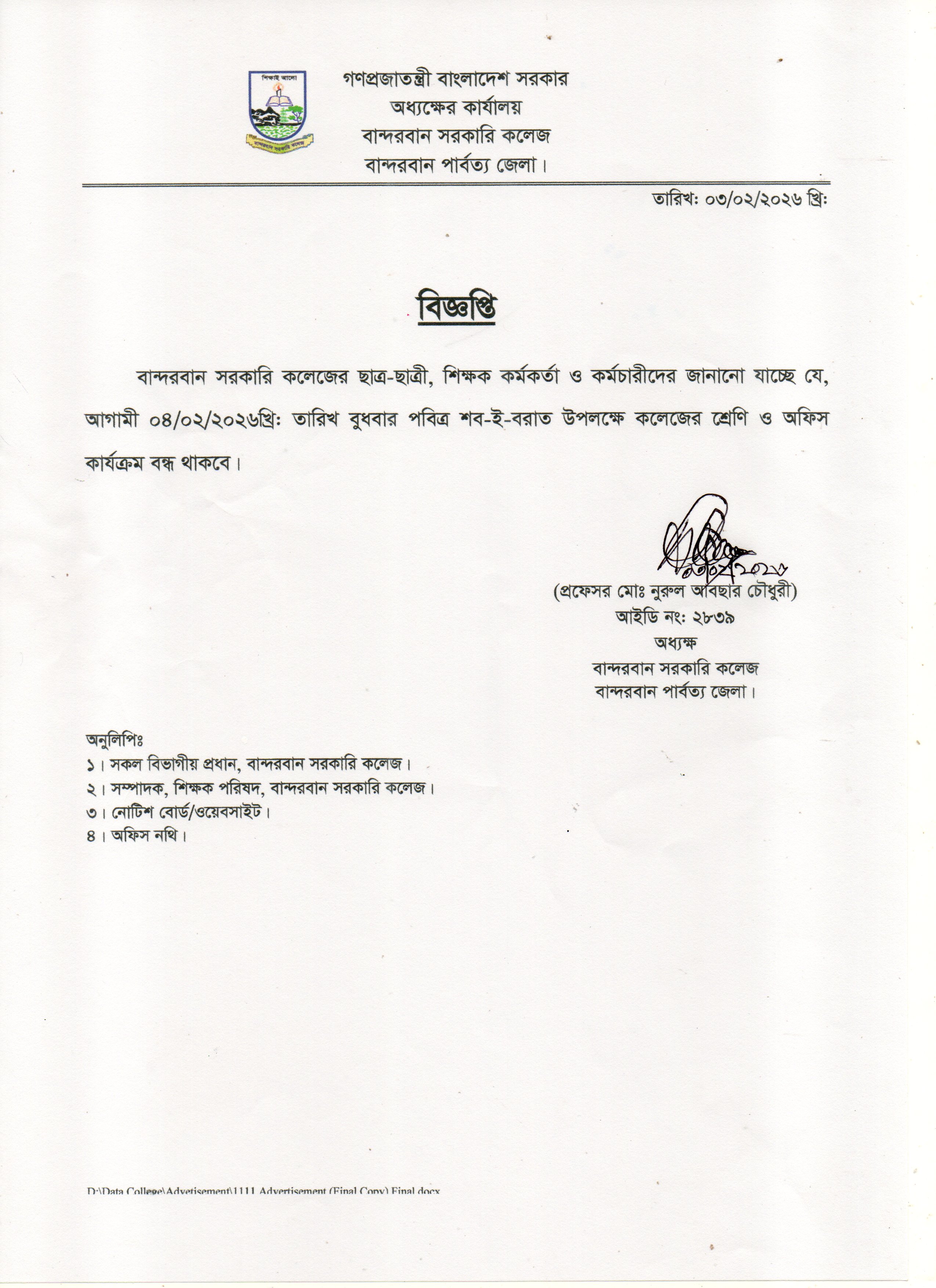 পবিত্র শব-ই-বরাত উপলক্ষে কলেজ বন্ধের বিজ্ঞপ্তি