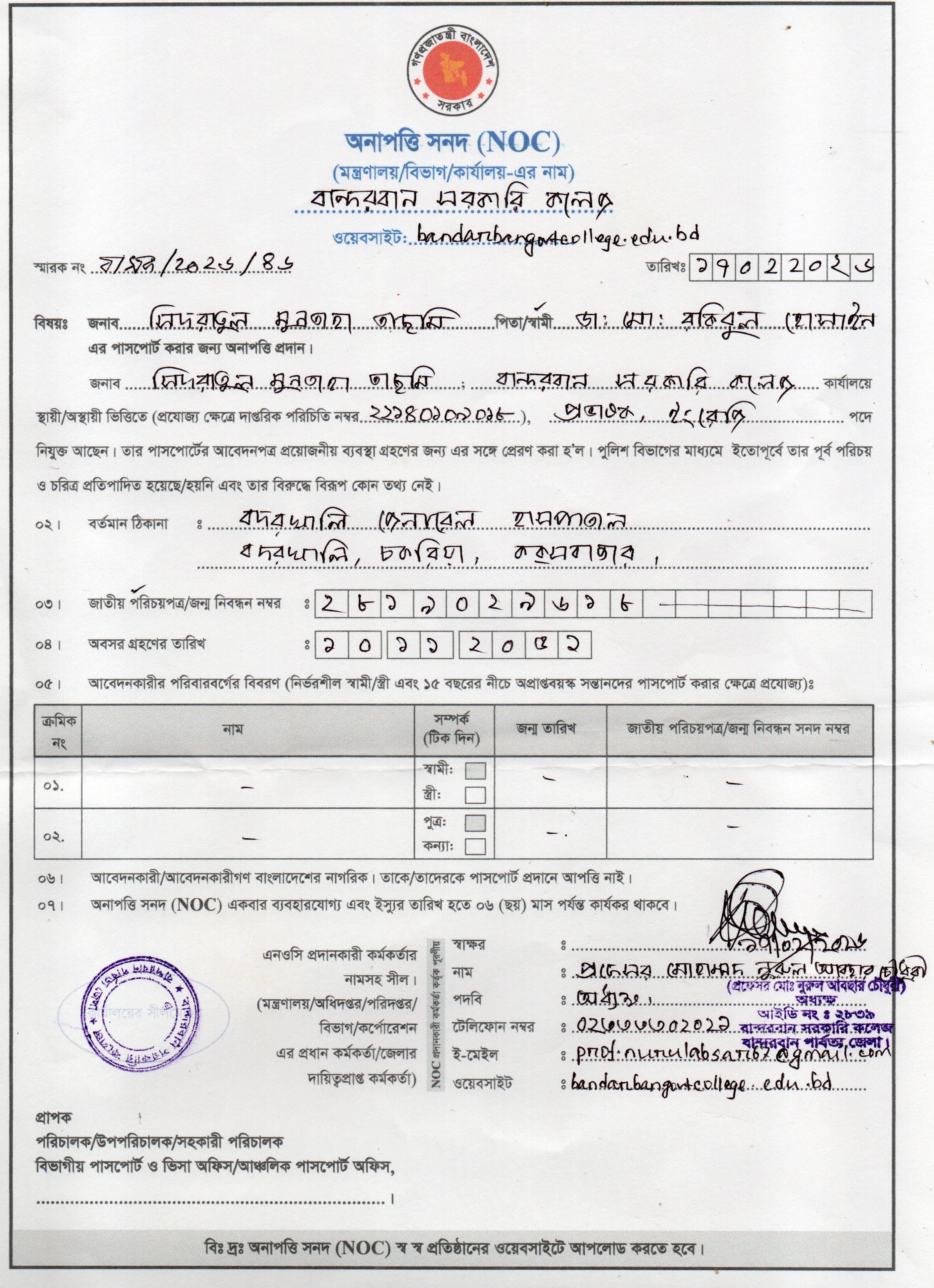 বান্দরবান সরকারি কলেজের ইংরেজি বিভাগের প্রভাষক জনাব সিদরাতুল মুনতাহা তাছমি এর এনওসি প্রদান