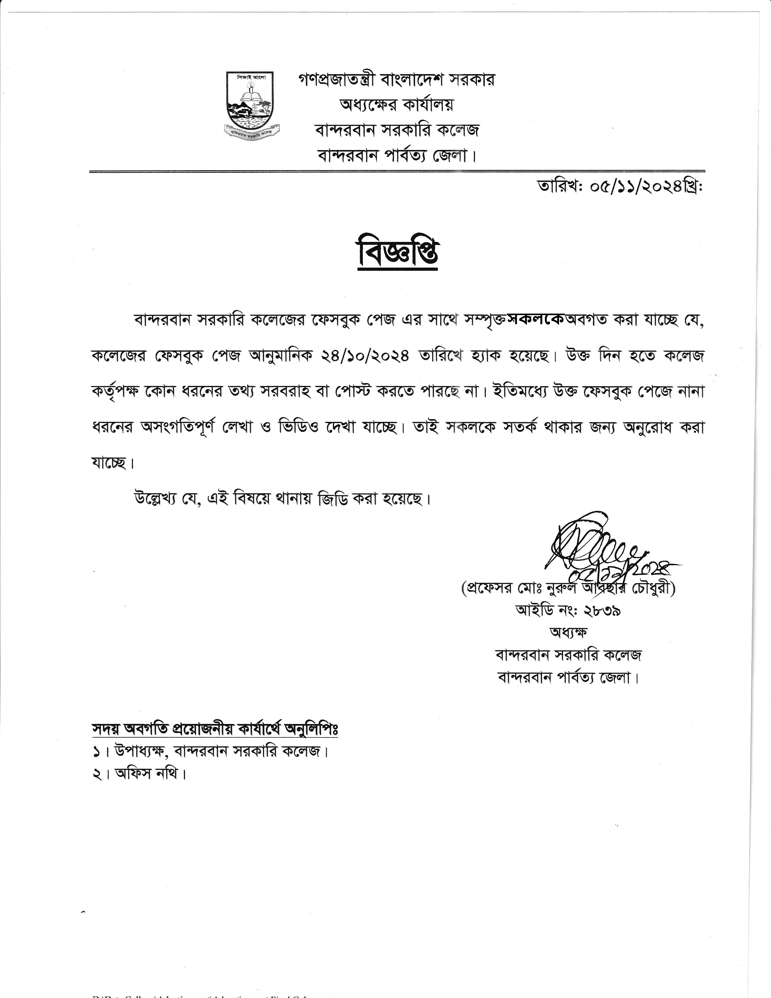শ্রী শ্রী দূর্গা পূজা, ফাতেহা-ই-ইয়াজদাহম, প্রবারণা পূর্ণিমা ও লক্ষী পূজা উপলক্ষ্যে ক্লাস বন্ধের বিজ্ঞপ্তি