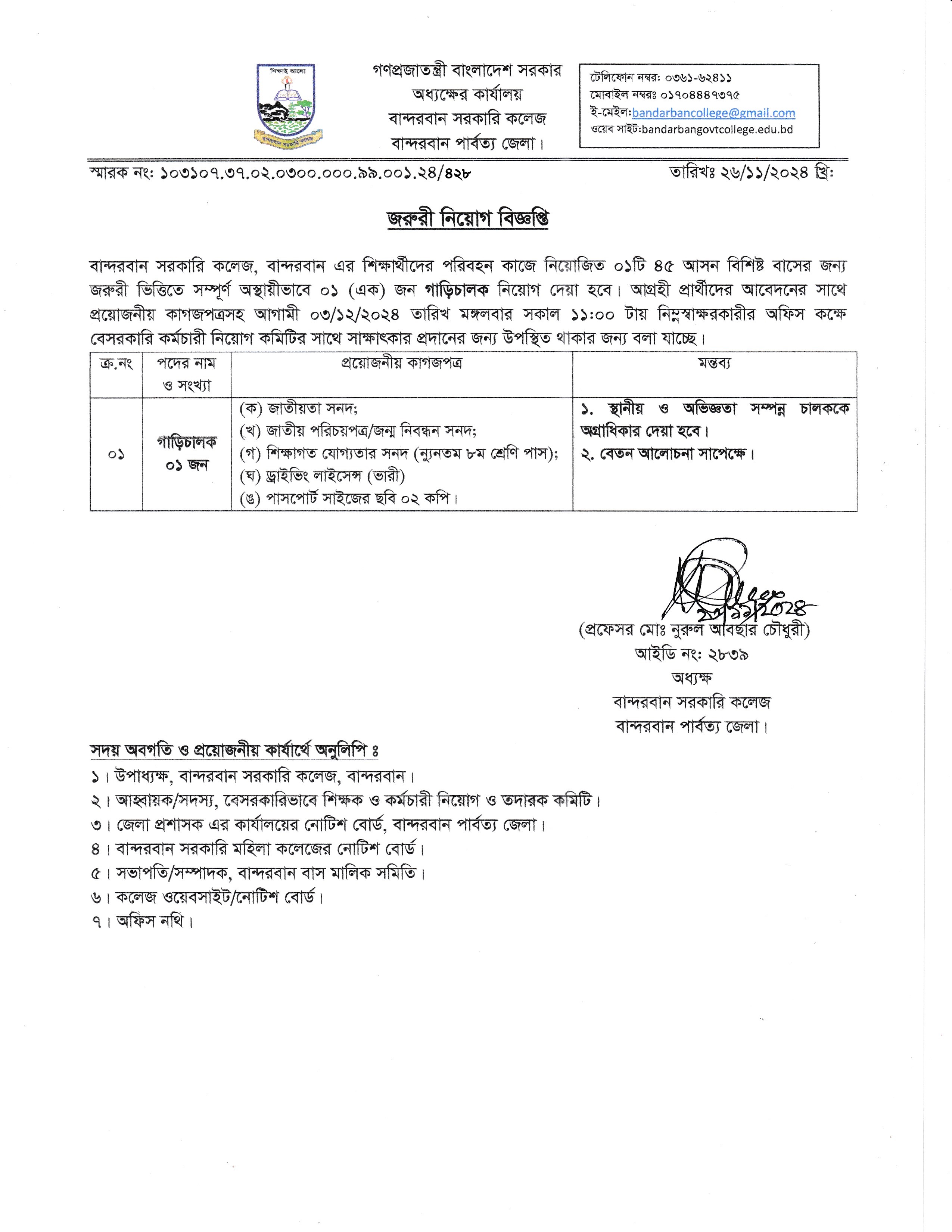 গাড়ি চালক পদে নিয়োগ বিজ্ঞপ্তি