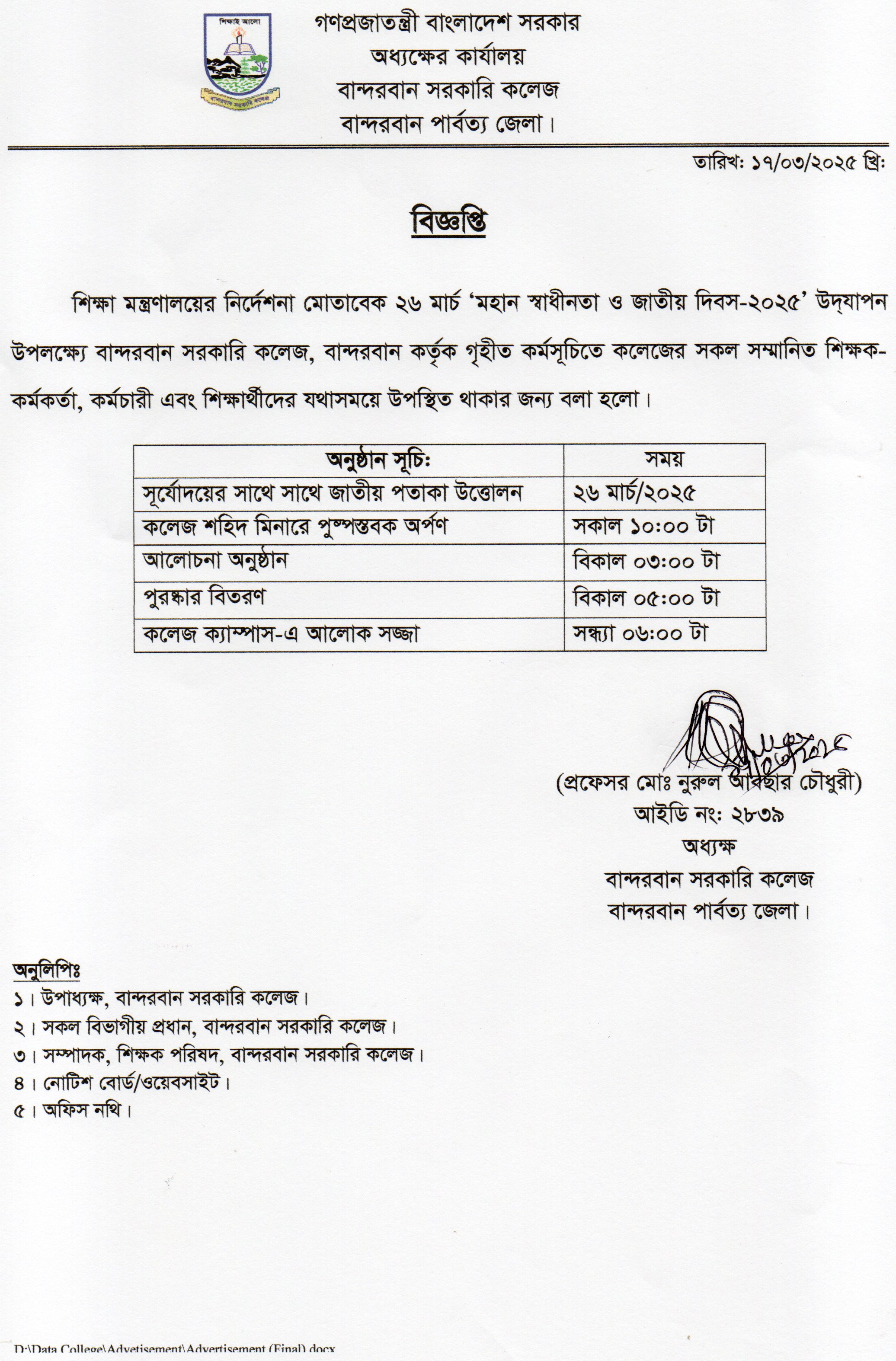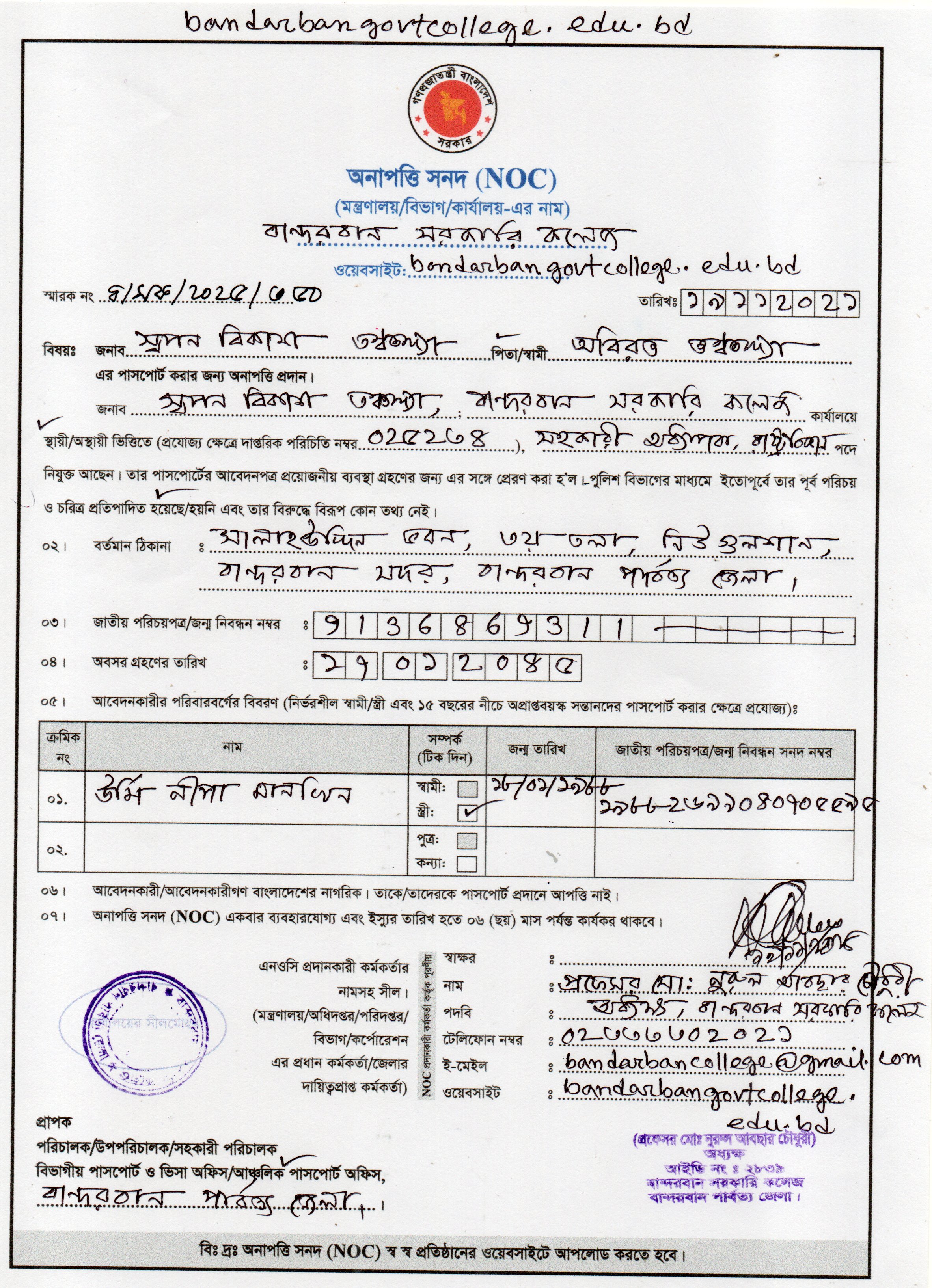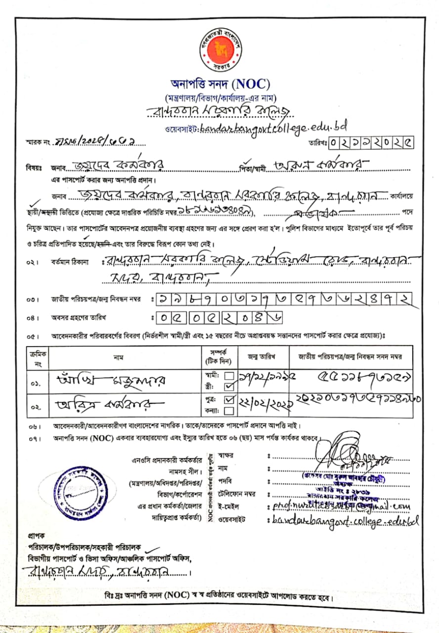 বান্দরবান সরকারি কলেজের ব্যবস্থাপনা বিভাগের প্রভাষক জনাব জয়দেব কর্মকার এর NOC প্রদান
