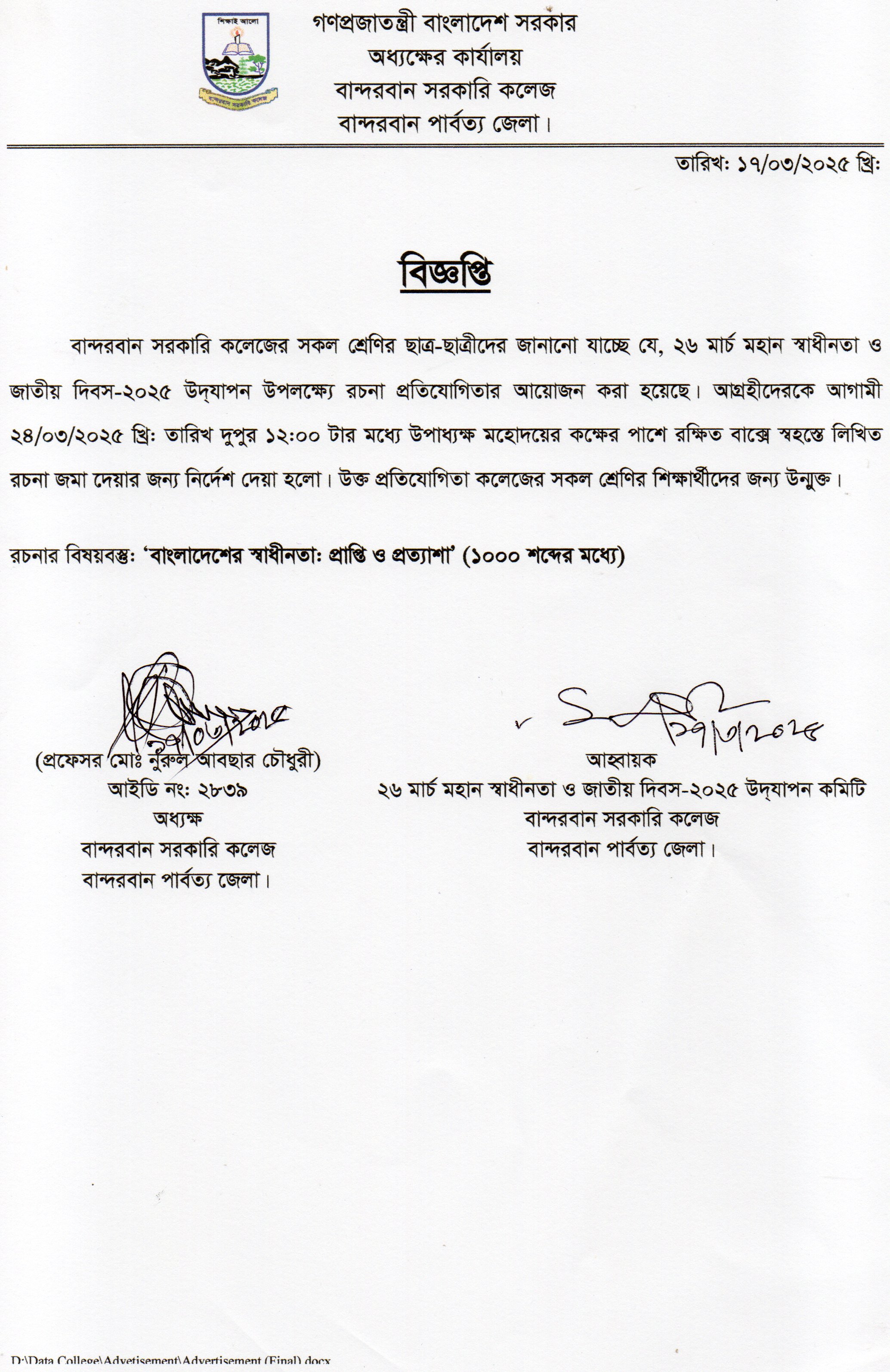 মহান স্বাধীনতা দিবস ২০২৫ উপলক্ষ্যে রচনা প্রতিযোগিতা