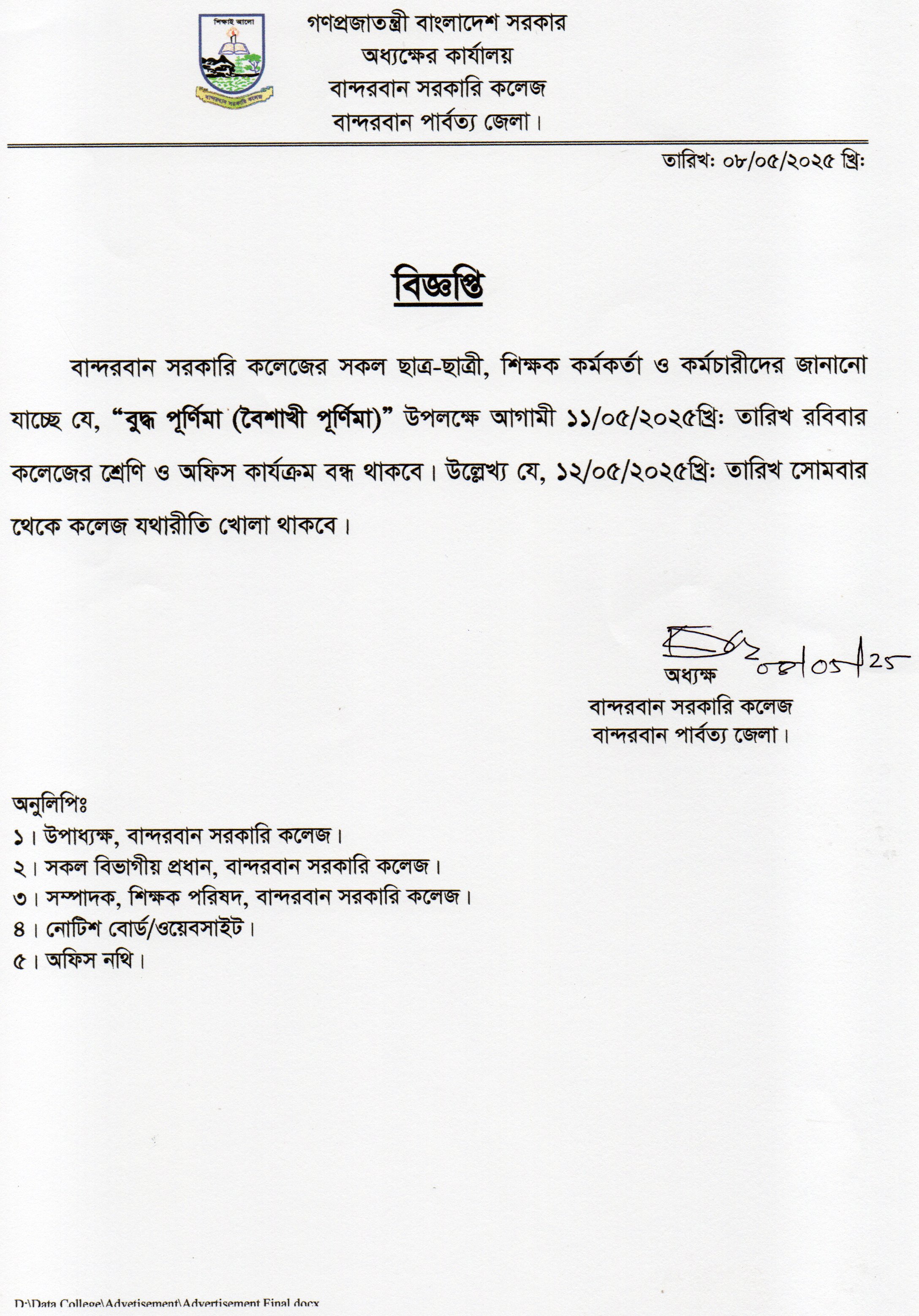 বুদ্ধ পূর্ণিমা উপলক্ষ্যে ক্লাস ও অফিস বন্ধের নোটিশ