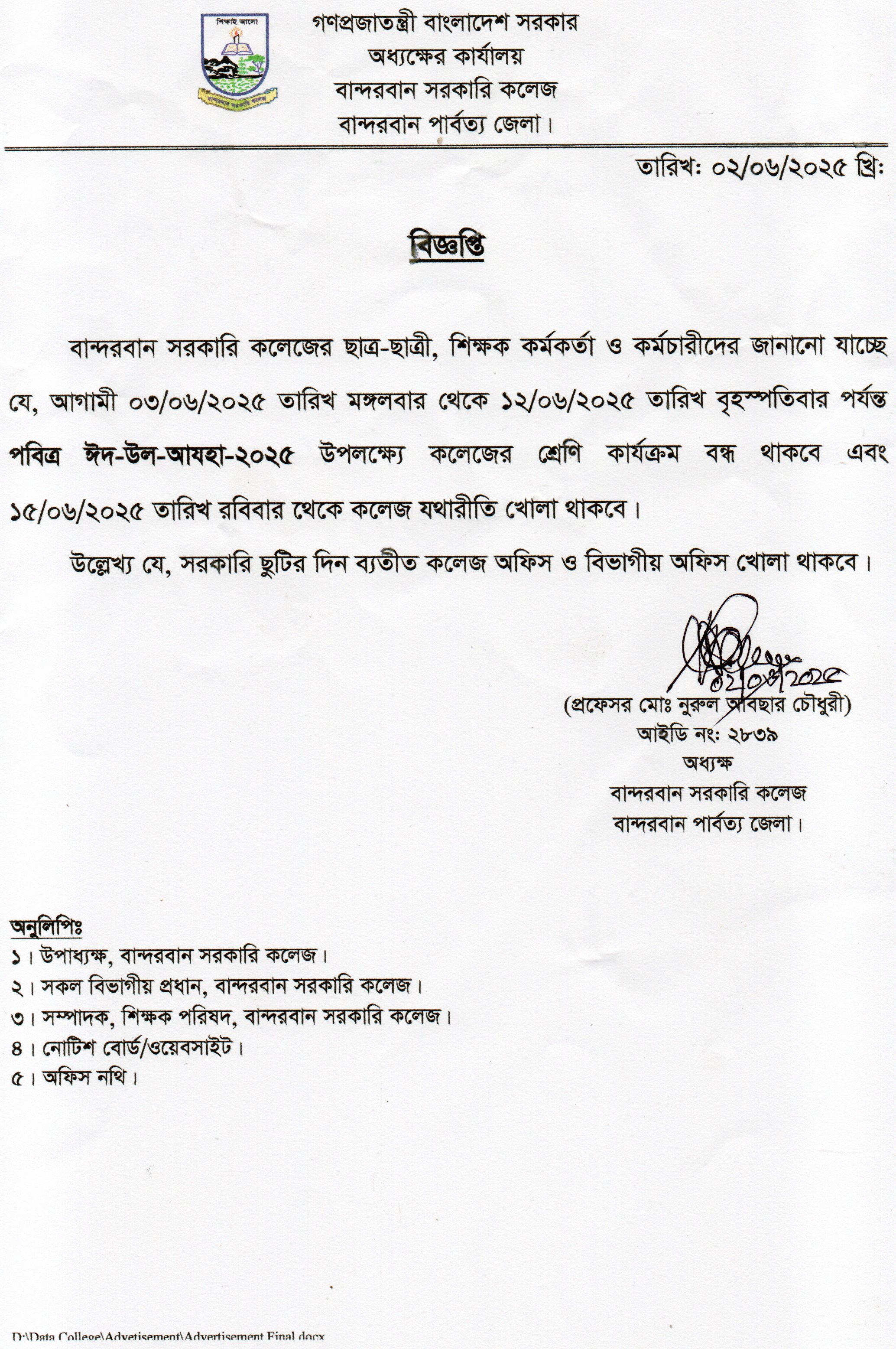 পবিত্র ঈদ-উল-আযহা ২০২৫ এর কলেজ বন্ধের বিজ্ঞপ্তি