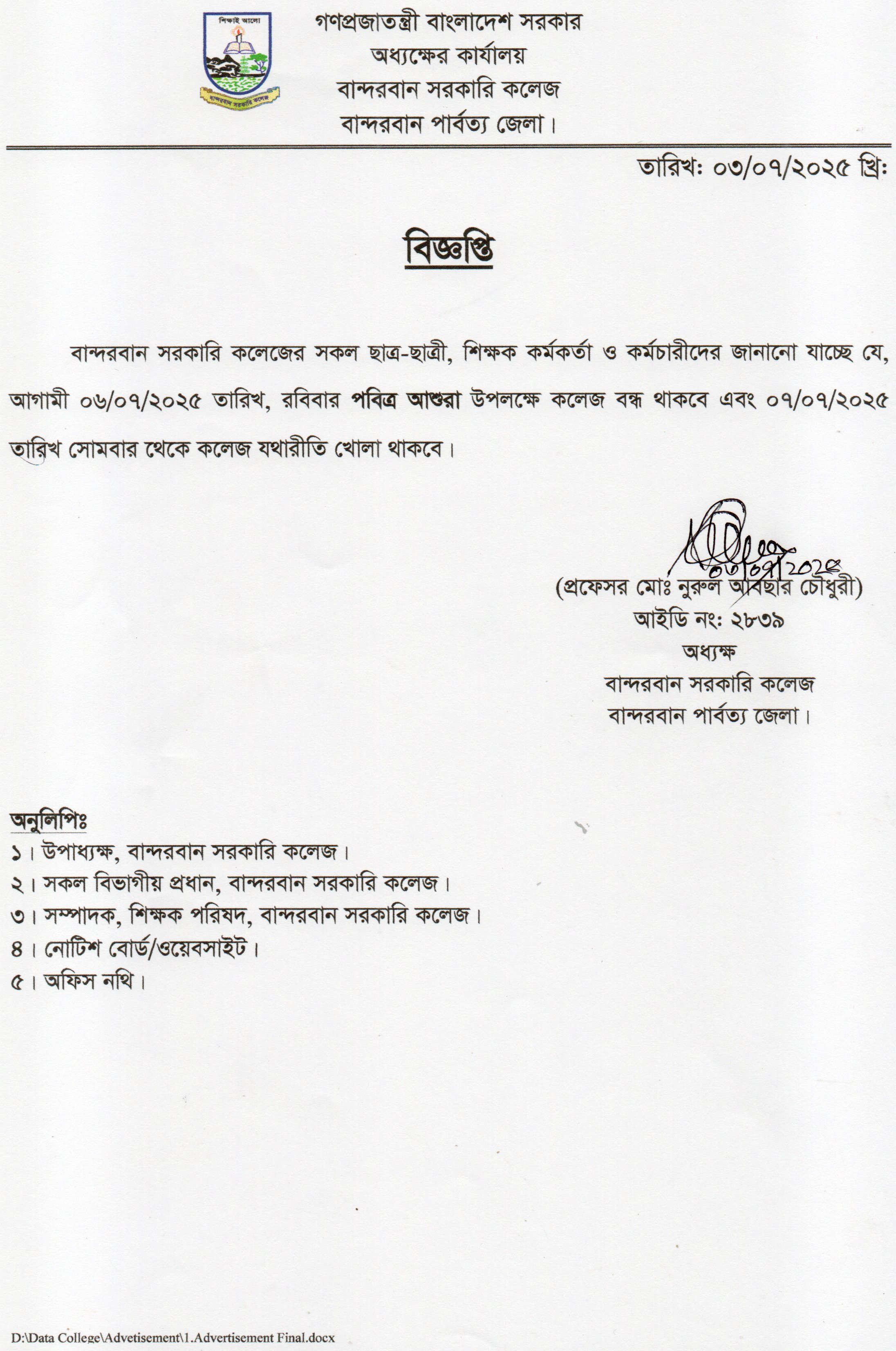 পবিত্র আশুরা উপলক্ষে কলেজ বন্ধের নোটিশ