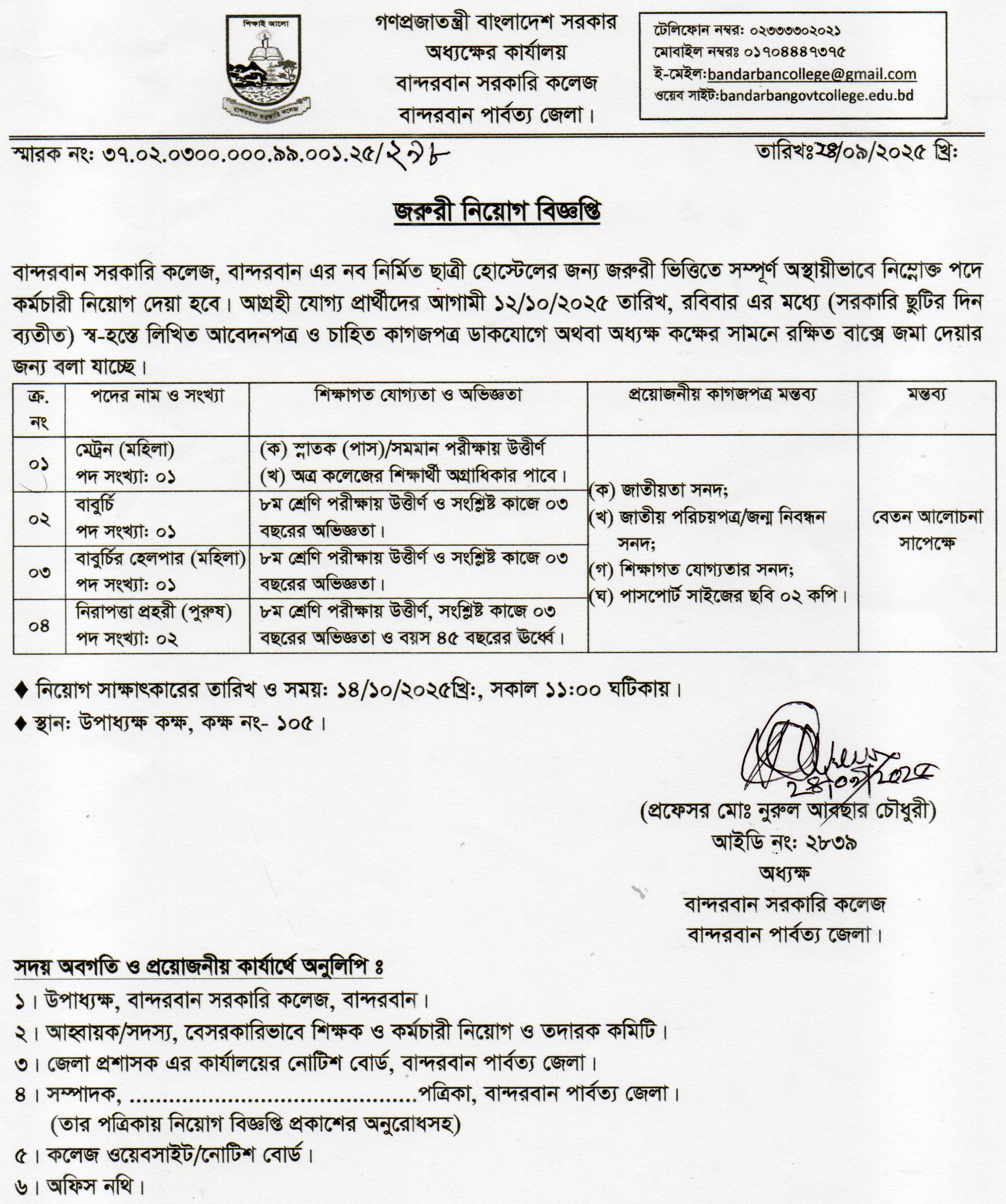 কর্মচারী নিয়োগ বিজ্ঞপ্তি