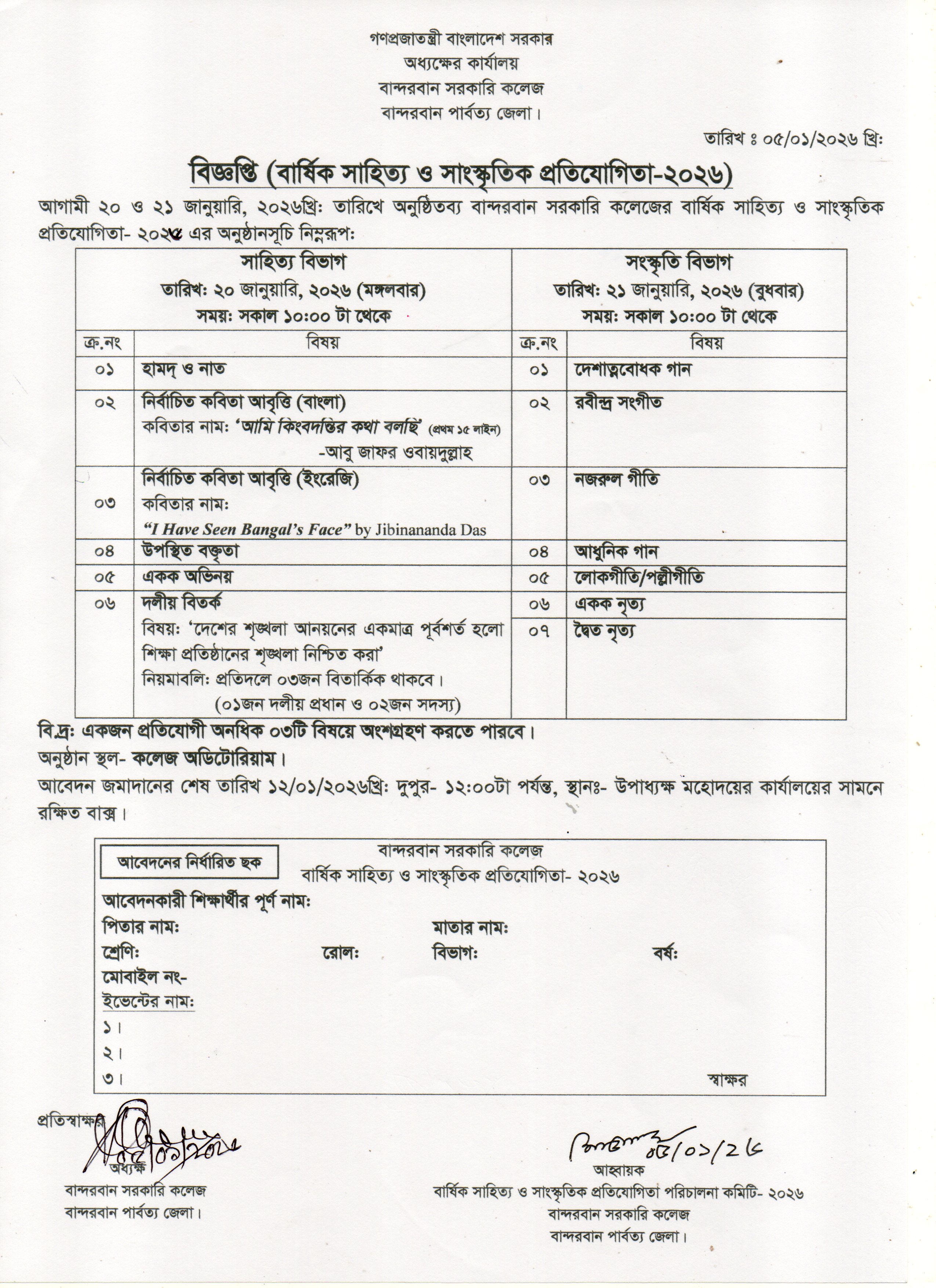 বার্ষিক সাহিত্য ও সাংস্কৃতিক প্রতিযোগিতা ২০২৬ এর বিজ্ঞপ্তি