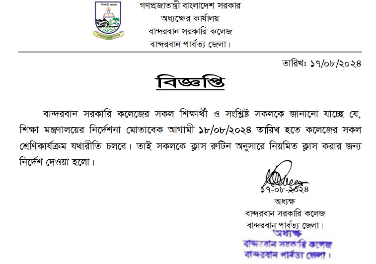 শ্রেণি কার্যক্রম বন্ধের নোটিশ
