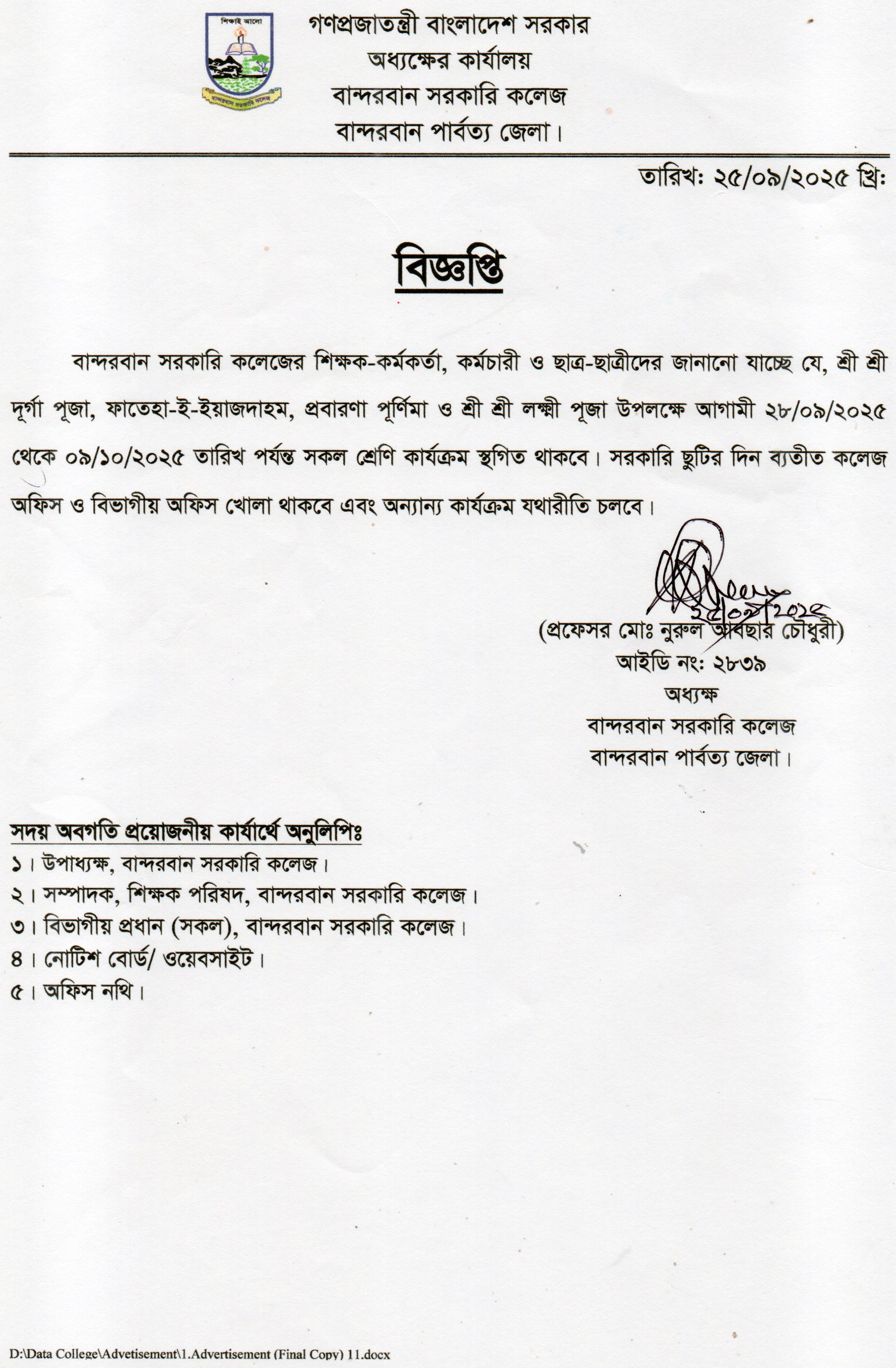 শ্রী শ্রী দূর্গা পূজা, ফাতেহা-ই-ইয়াজদাহম, প্রবারণা পূর্ণিমা ও লক্ষী পূজা উপলক্ষ্যে ক্লাস বন্ধের বিজ্ঞপ্তি