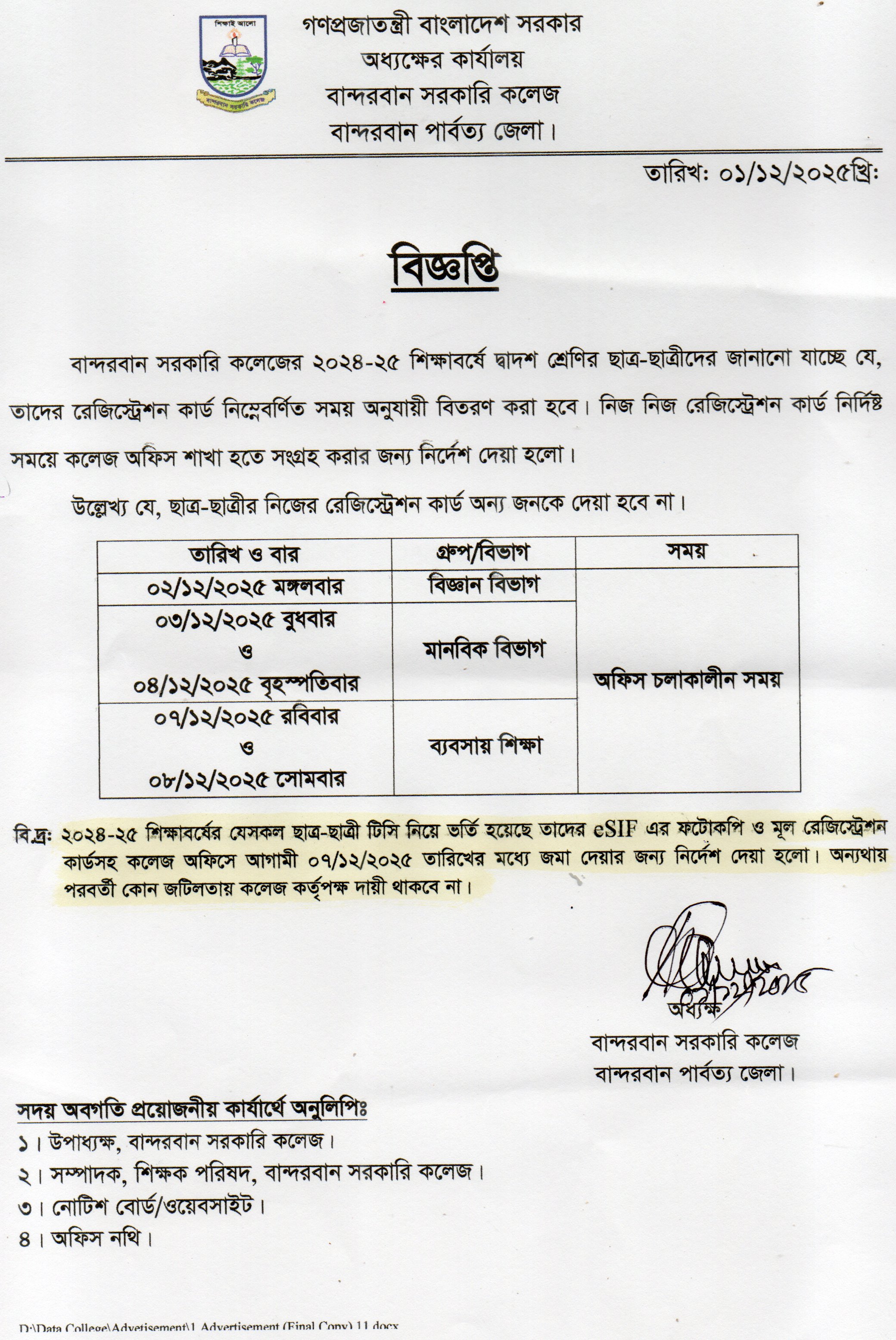 ২০২৪-২৫ শিক্ষাবর্ষের দ্বাদশ শ্রেণির শিক্ষার্থীদের রেজিস্ট্রেশন কার্ড বিতরণ বিজ্ঞপ্তি