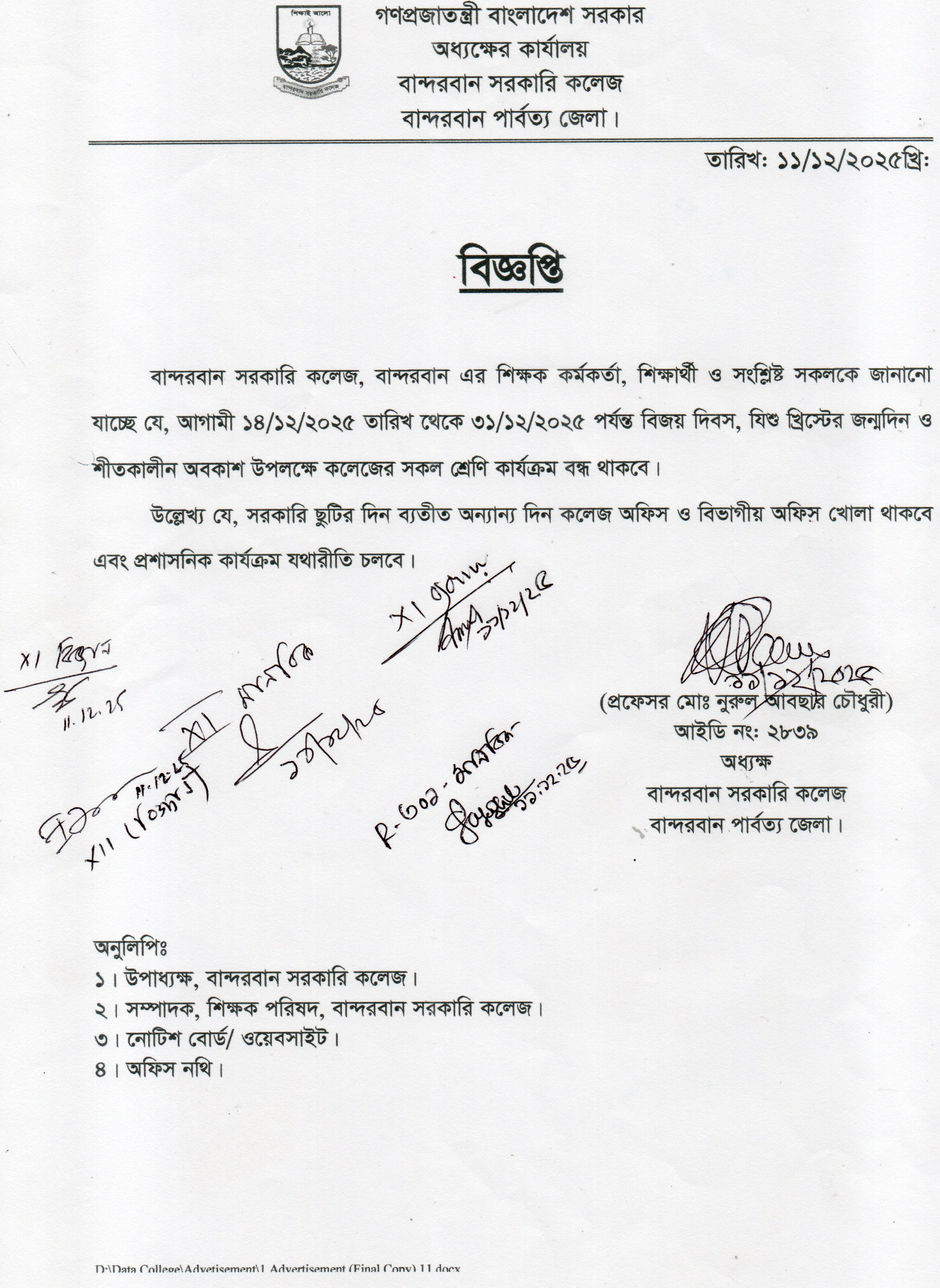 শীতকালীন অবকাশ, বিজয় দিবস, যিশু খ্রিস্টের জন্মদিন উপলক্ষ্যে ক্লাস বন্ধের নোটিশ