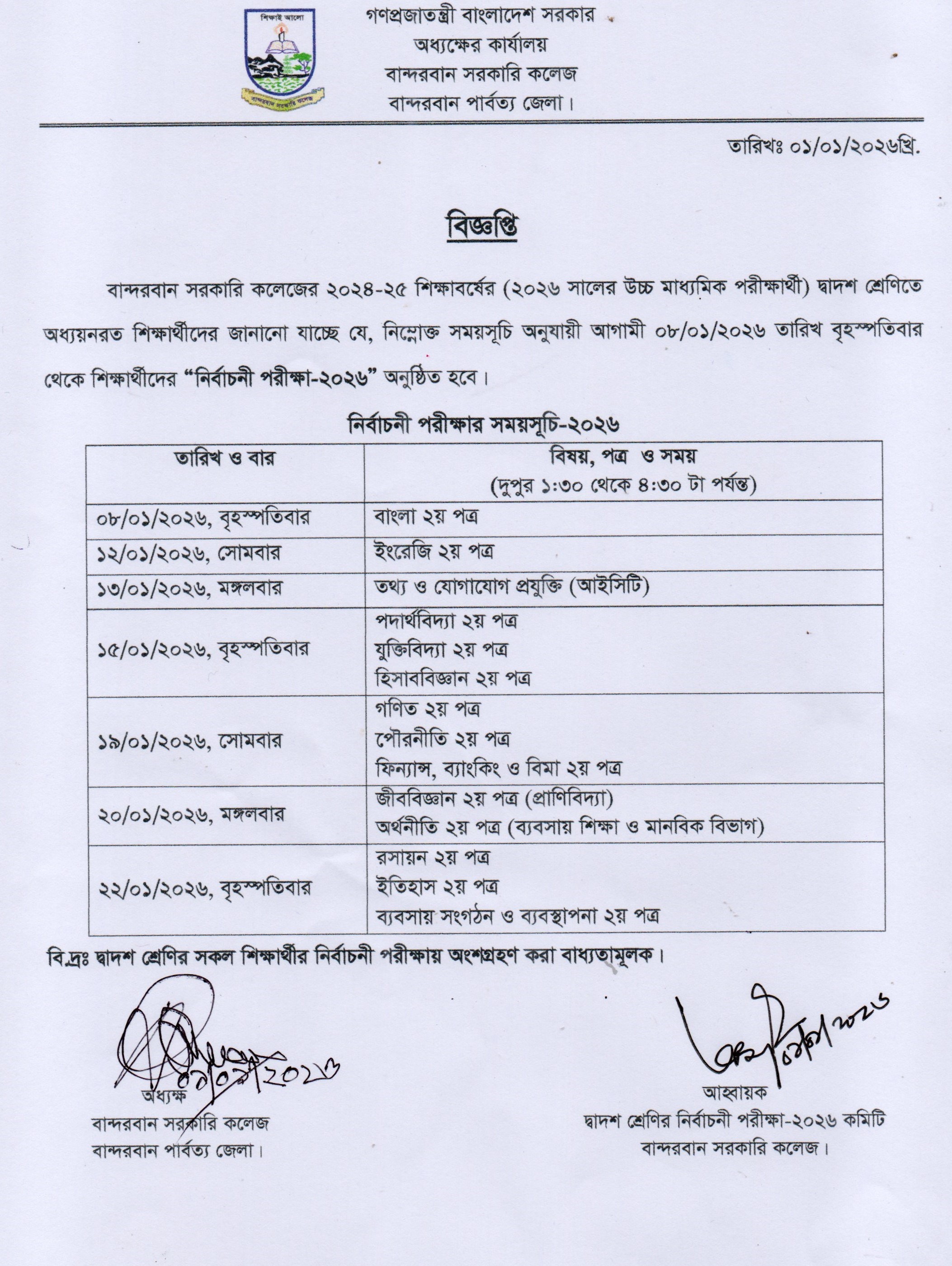 ২০২৪-২৫ শিক্ষাবর্ষের দ্বাদশ শ্রেণির নির্বাচনী পরীক্ষা ২০২৬ এর রুটিন