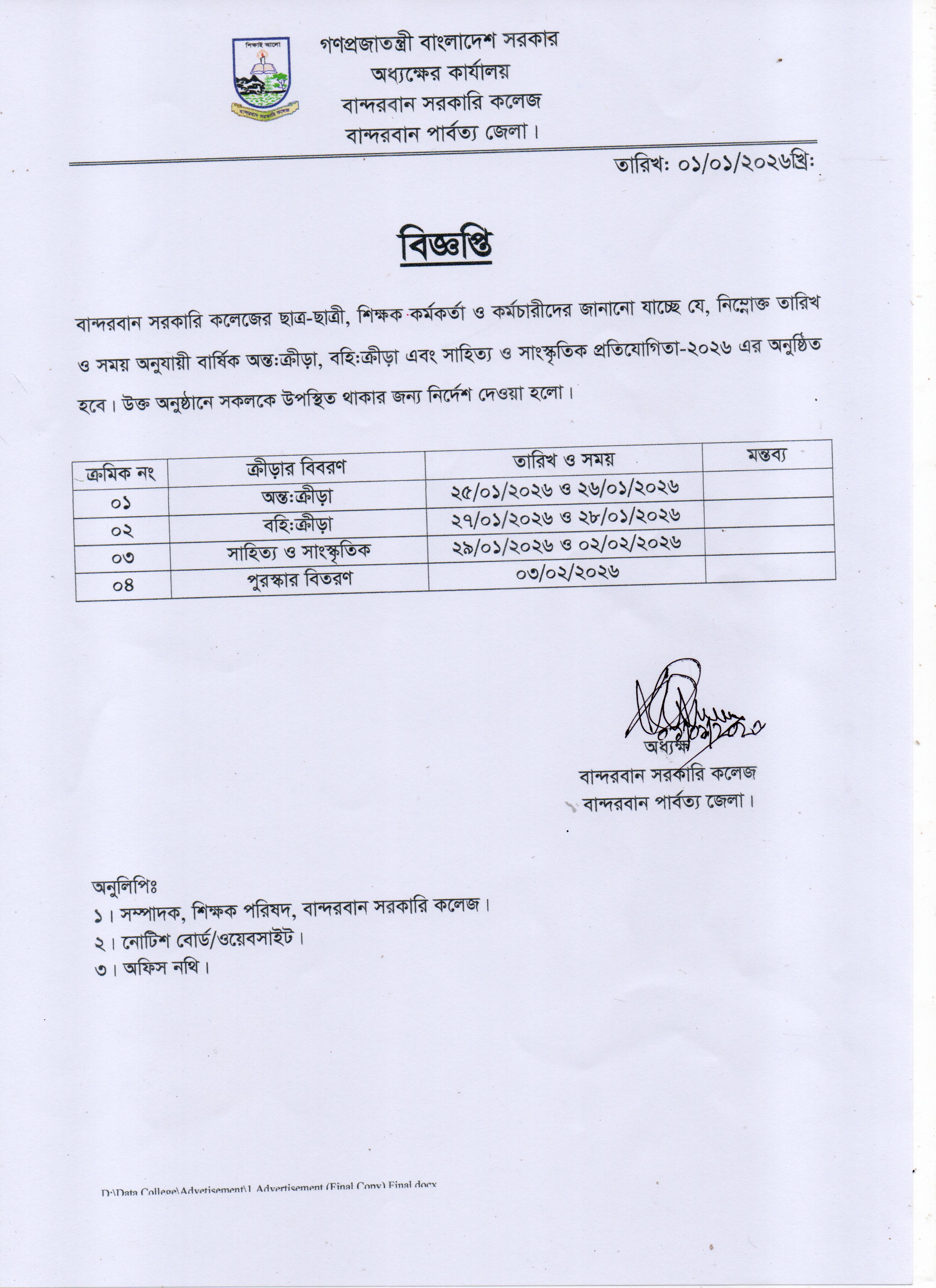 বার্ষিক অন্ত:ক্রীড়া, বহি:ক্রীড়া এবং সাহিত্য ও সাংস্কৃতিক প্রতিযোগিতা ২০২৬ এর বিজ্ঞপ্তি