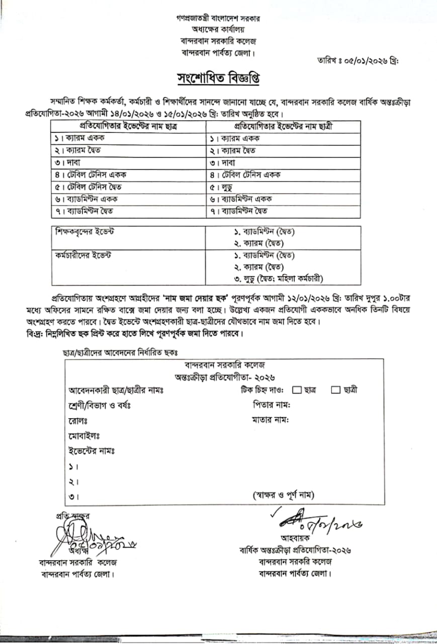 বার্ষিক অন্ত:ক্রীড়া প্রতিযোগিতা ২০২৬ এর সংশোধিত বিজ্ঞপ্তি